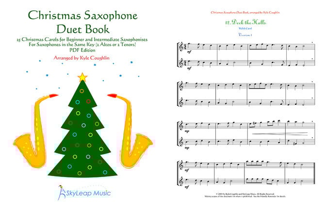 55 different arrangements of 25 popular carols arranged specifically for two saxophones in the same key. The difficulty ranges from beginner to intermediate. There are at least two arrangements of each carol, one with the melody entirely in the top line, and one with the melody exchanged between both voices. Includes Jingle Bells, Silent Night, Deck the Hall, Joy to the World, O Christmas Tree, and twenty more. For more info and a complete list of the carols, visit http://www.skyleapmusic.com/ChristmasSaxophoneDuetBook.html